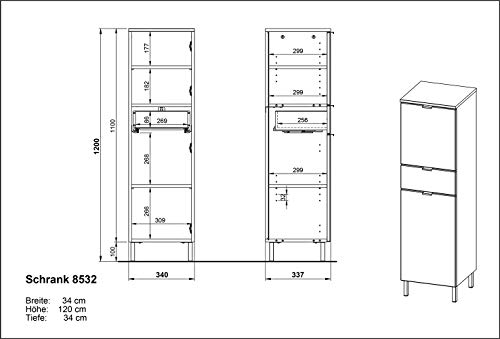 - Badmöbel-Set bestehend aus einem Waschbeckenunterschrank, einem Schrank und einem Spiegel. Waschbeckenunterschrank mit einer Klappe und einem Schubkasten rechts und einer Tür links - dahinter ein verstellbarer Einlegeboden; Oberboden mit Aussparung für Siphon. Schrank mit einer Schublade und zwei Türen - dahinter je ein verstellbarer Einlegeboden. Spiegel mit Ablageboden und LED-Beleuchtung.
