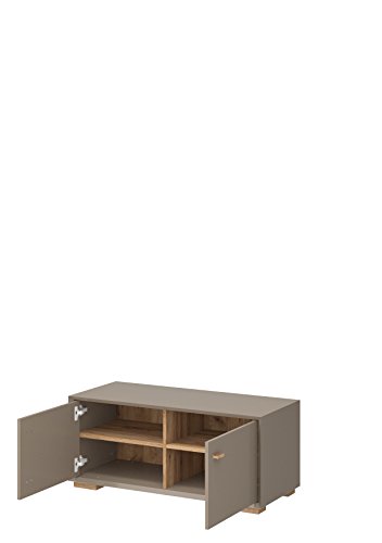 - Korpusse und Fronten: Melaminharz-beschichtete Spanplatte in Steingrau und zum Teil in Navarra-Eiche-Nb.; Griffe und Füße aus Massivholz