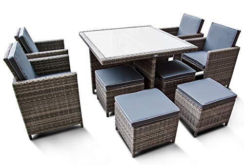- große sehr edle Dining Garten Essgruppe mit Platz für bis zu 8 Personen. Bequeme Sitzgruppe mit hohem Esstisch und viel Platz, Doppelhalbrund-Rattan in meliertem Grau